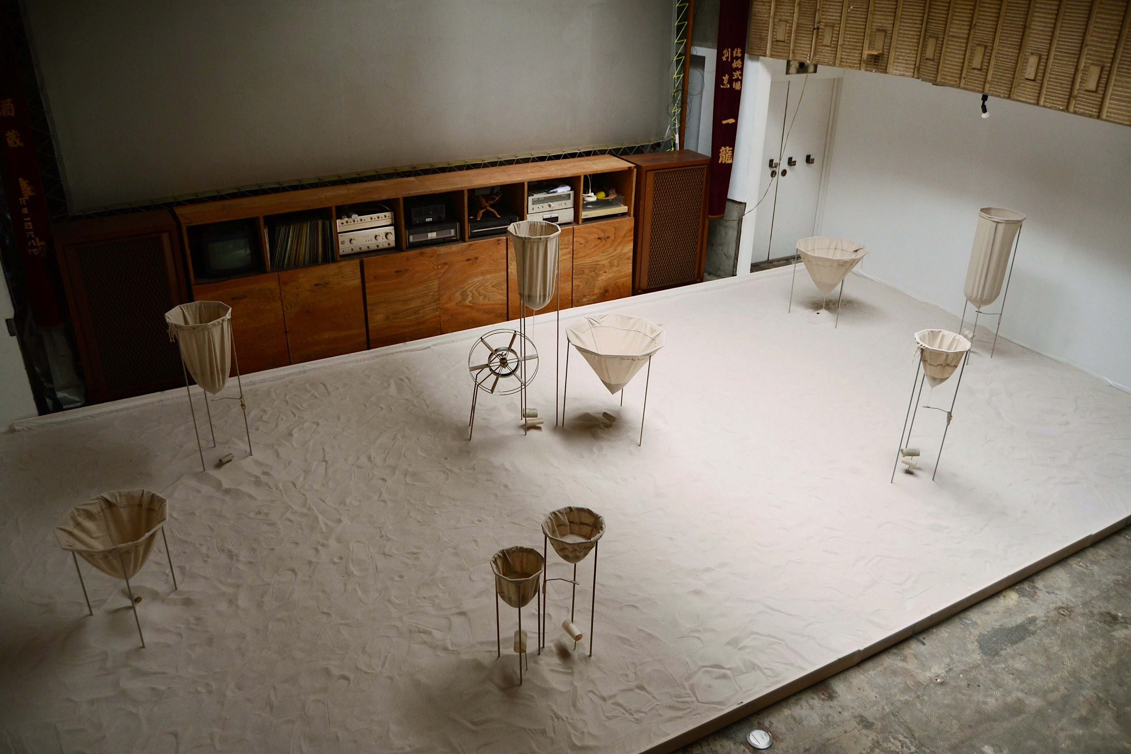 1991年に閉館した映画館である日暮里金美館を改修してつくられた「元映画館」という会場に約750kgの砂を敷き、展覧会を開催しました。無声映画の時代は、映画館で生演奏をして音楽を添えていたことから、映画館は音が聴こえる場所であると思い、砂が流れる音で包まれた空間をつくりました。会場内は、昼は天窓からの自然光、夜はスクリーンからの光で照らされます。